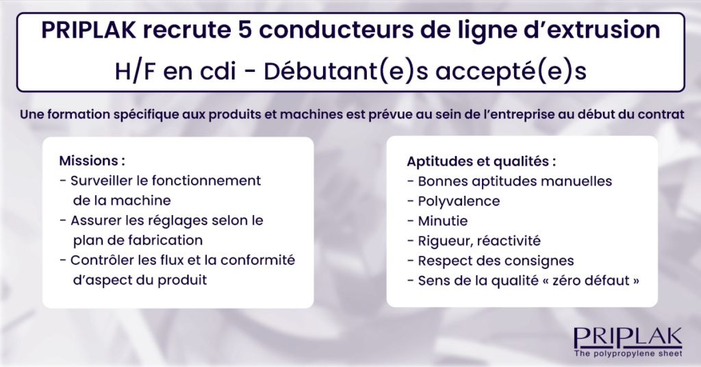 PRIPLAK recrute 5 conducteurs de ligne d’extrusion H/F en cdi Débutant(e)s accepté(e)s En collaboration avec Pôle Emploi, nous organisons une matinée de recrutement le 27 septembre 2022 à la mairie de Neuilly-en-Thelle. Une formation spécifique aux produits et machines est prévue au sein de l’entreprise au début du contrat Missions :- Surveiller le fonctionnement de la machine – Assurer […]